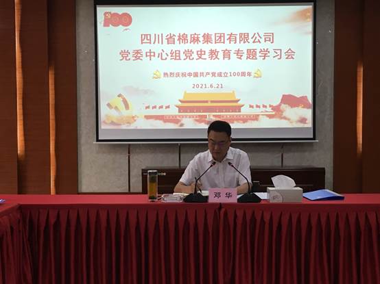在小结讲话中,邓华要求,一是坚定制度自信,增强制度自觉。要坚定理想信念,永葆对党绝对忠诚的政治品格;要树立辩证史观,正确看待社会主义革命和建设时期历史;要牢牢把握规律,不断强化走中国特色社会主义道路坚定决心;要赓续精神血脉,大力弘扬艰苦奋斗的创业精神。二是提高政治站位,扎实学习教育。无论集团层面,还是各党支部、各部门、各子(分)公司都要根据省社党组及集团公司党委安排,高标准高质量组织好“四史”学习教育。三是弘扬伟大精神,不断“攒劲”聚力。要从党史中涵养“钢少气多骨头硬”的精气神,攒“拼劲”,勇于面对各种风险挑战,着力破解各种制约发展的瓶颈和问题,奋力推进各业务板块高质量发展;要从党史中厚植“一枝一叶总关情”的为民情怀,攒“亲劲”,各级党员干部特别是班子成员,要主动带头深入基层一线,苦干实干,在项目、业务落地落实中出智出力解难题,在“我为群众办实事”实践活动中为职工群众谋福利;从党史中弘扬“敢教日月换新天”的奋斗精神,攒“干劲”,各级党员干部要弘扬艰苦奋斗的精神,以梦为马,以实干为鞭,立下硬决心、拿出硬举措,敢挑最重的担子,敢啃最硬的骨头,敢接最烫的山芋,跃马扬鞭,把“小我”融入到“大我”中,把青春融入到棉麻高质量发展的进程中,以不负韶华、不负时代的姿态,在新征程的路上吹起想为、敢为、善为的担当实干之风。